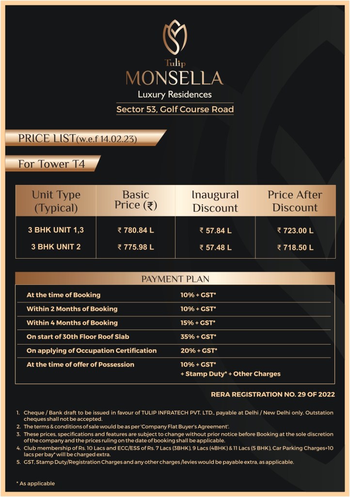 - Booking Amount: The booking amount required to secure your dream home at Tulip Monsella is kept reasonable, making it easier for aspiring homeowners to initiate the purchase process without a substantial upfront investment.